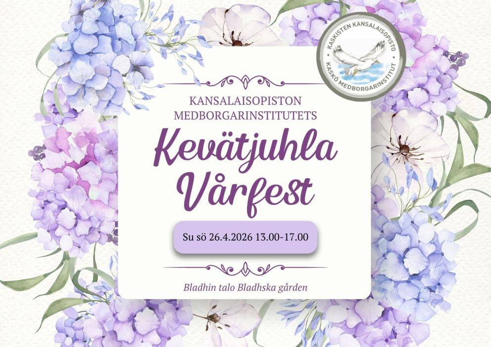 26.04.2026 13:00 - 17:00Kaskisten kansalaisopisto kutsuu kevätjuhlaan sunnuntaina 26.4. klo 13–17 Bladhin taloon.