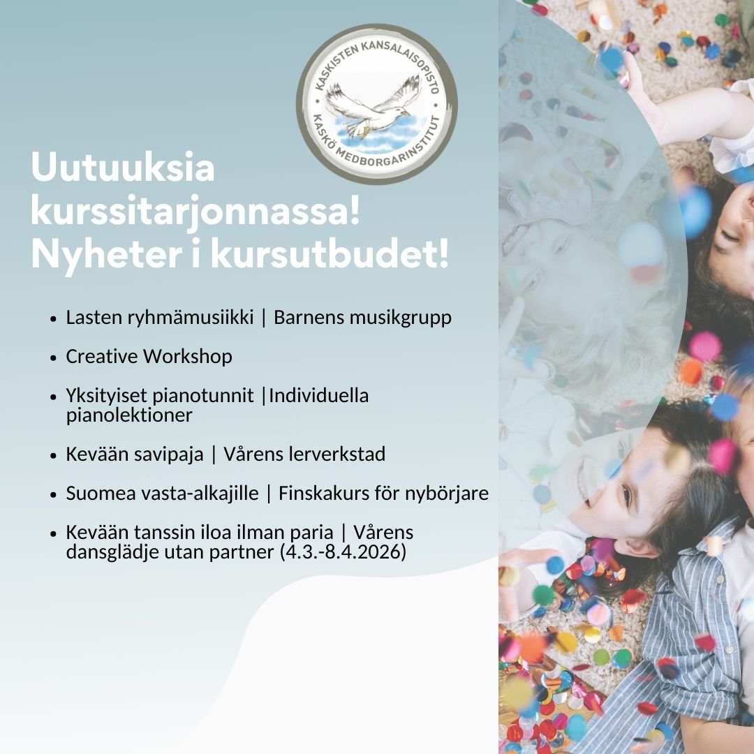 Kaskisten kansalaisopistossa on jotain jokaiselle – iästä tai kiinnostuksen kohteista riippumatta! Täällä voit oppia uusia taitoja, syventää osaamistasi tai yksinkertaisesti viettää aikaa mielekkäästi ja hauskasti.