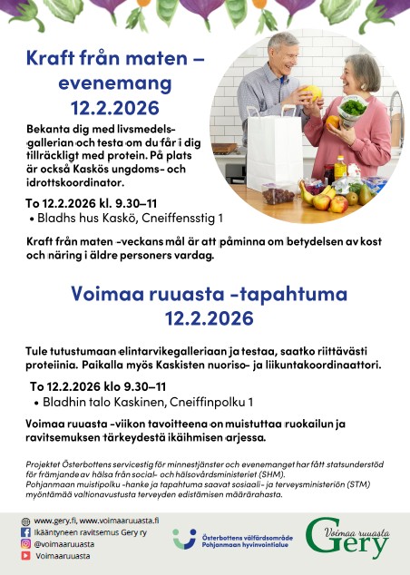 Tule tutustumaan elintarvikegalleriaan ja testaamaan saatko riittävästi proteiinia. Tule tapaamaan Pohjanmaan hyvinvointialueen muistipolku hankkeen väkeä: to 12.2.2026, Bladhin talolla klo 9.30–11.