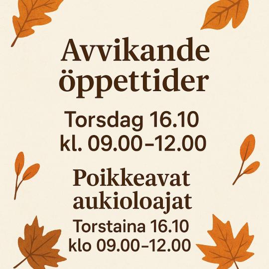 Denna veckas torsdag (16.10) avvikande öppettider.