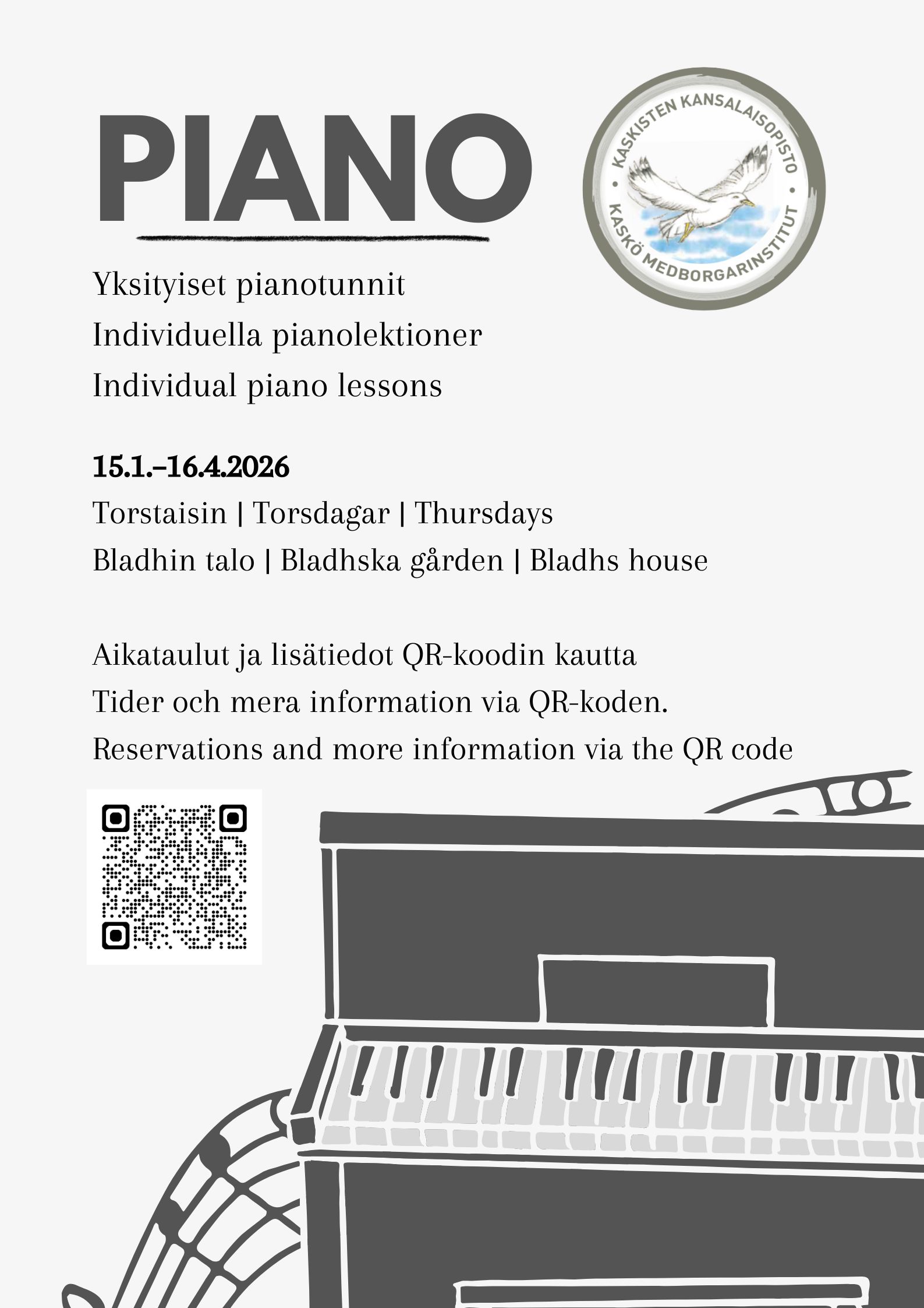 Hos Kaskö Medborgarinstitut finns något för alla – oavsett ålder eller intresse! Här kan du lära dig nya färdigheter, fördjupa dina kunskaper eller helt enkelt ha roligt och fylla din fritid med meningsfulla aktiviteter.